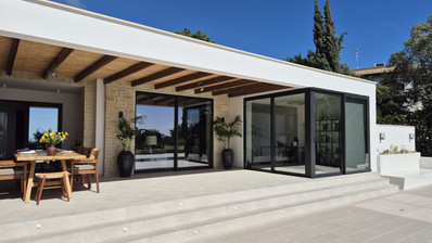 Situated on a gently sloping 1427sqm plot this unique property features a large front-yard with a private drive-way, automatic gates and 2 parking places. The south-facing section of the villa has large floor-to-ceiling windows and sliding doors that lead to the 10x5m private pool, a shaded lounge area and a 200sqm terrace with views of the Mediterranean Sea sparkling in the distance.