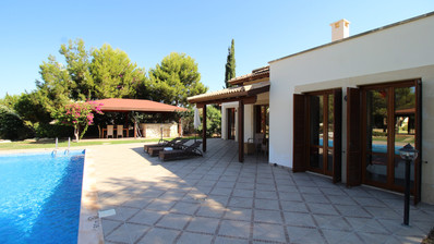 Stepping outside is quite breath-taking with plenty of entertainment areas to use include a spectacular BBQ area with dining facilities and a separate pergola at the end of the garden for those relaxing moments of the day. The owner was very clever when building the villa because the villa is built on one plot and the second plot is currently used as a garden giving the prospective buyer the opportunity to build a completely separate luxury villa on the grounds. The owner is selling the villa fully furnished with all luxury fixtures and fittings. The owner has also included in the property a private water well saving a lot of money per year plus extras like traditional Cypriot clay ovens etc. The property is very unique in its own right and has to be viewed to be fully appreciated. Appointments are strictly by appointment only.