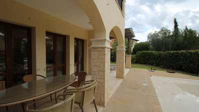 This stunning 2-Bed, 2-bath apartment is in the upmarket location of Theseus Village here at the Aphrodite Hills Golf and Leisure Resort which is just a few minutes’ walk to the 5-Star amenities of this magnificent resort. Entering the property, you are greeted with a very spacious and airy lounge area with an open planned dining area with full glass solid wood doors letting in ample light from the pool area and a separate luxury kitchen with full granite worktops and all the latest brand appliances in stainless steel fitted in, all you would except to find in this very fine property. To the left of the lounge you will find a very spacious bedroom with fully fitted luxury wardrobes and a main luxury bathroom. To the right of the lounge you come to the very spacious master bedroom suite with fully fitted luxury wardrobes and a luxury en-suite bathroom. Both bedrooms, as with the living area lead out to the splendid terrace area which again is very spacious offering plenty of entertainment areas which are covered and a beautiful private garden area with mature shrubs and lawn area surrounding the private heated pool. The apartment is very rare on the market as its one of only a few apartments featuring a private pool in Theseus Village. This is an ideal opportunity to purchase one of the nicest apartments here at a very realistic price. The owners are selling the property fully furnished with all luxury fixtures and fittings and have priced the apartment to sell. The apartment offers a very healthy return making it a very sound investment also.